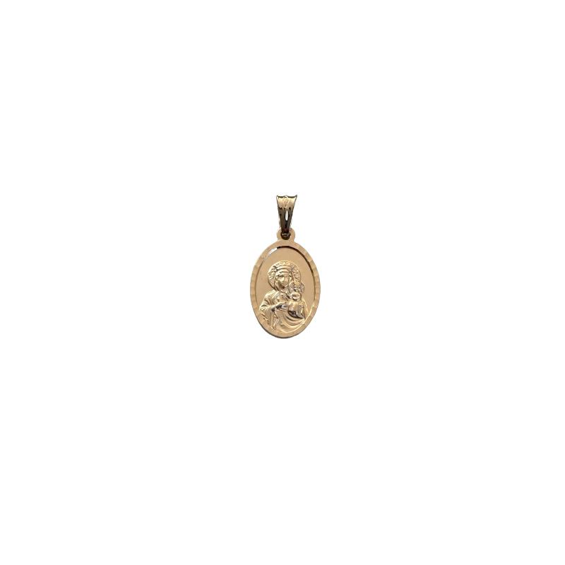 Piękny, niecodzienny medalik z  Matką Boską Częstochowską, wykonany ze złota pr.585. Wizerunek Matki Boskiej z Dzieciątkiem umieszczono w błyszczącej owalnej ramce.