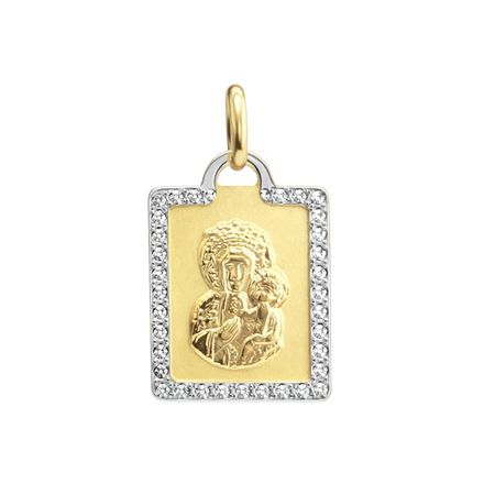 Medalik został wykonany z żółtego oraz białego złota próby 585 (14K). Klasyczna, prostokątna forma została wzbogacona o dekoracyjną ramkę wysadzaną cyrkoniami, które dodają biżuterii wyjątkowego blasku.