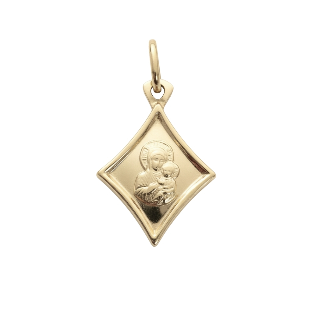Owalny medalik z wizerunkiem Matki Boskiej Częstochowskiej z Dzieciątkiem, przedstawionym w centralnej części w formie delikatnego reliefu. Twarze i kontury postaci są wyraźnie zaznaczone, a tło uzupełnia dekoracyjny ornament biegnący wzdłuż górnej części kompozycji. Obrzeże medalika pozostaje gładkie, co porządkuje całość i podkreśla klasyczny charakter modelu.