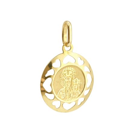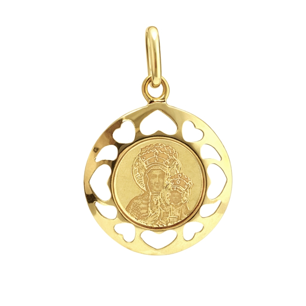 Medalik został wykonany z żółtego złota próby 585 (14K). Delikatna, okrągła forma oraz gładka, polerowana powierzchnia nadają elegancki i ponadczasowy charakter. Ażurowa oprawa ozdobiona subtelnymi wycięciami w kształcie serc dodaje biżuterii lekkości i dekoracyjnego stylu.