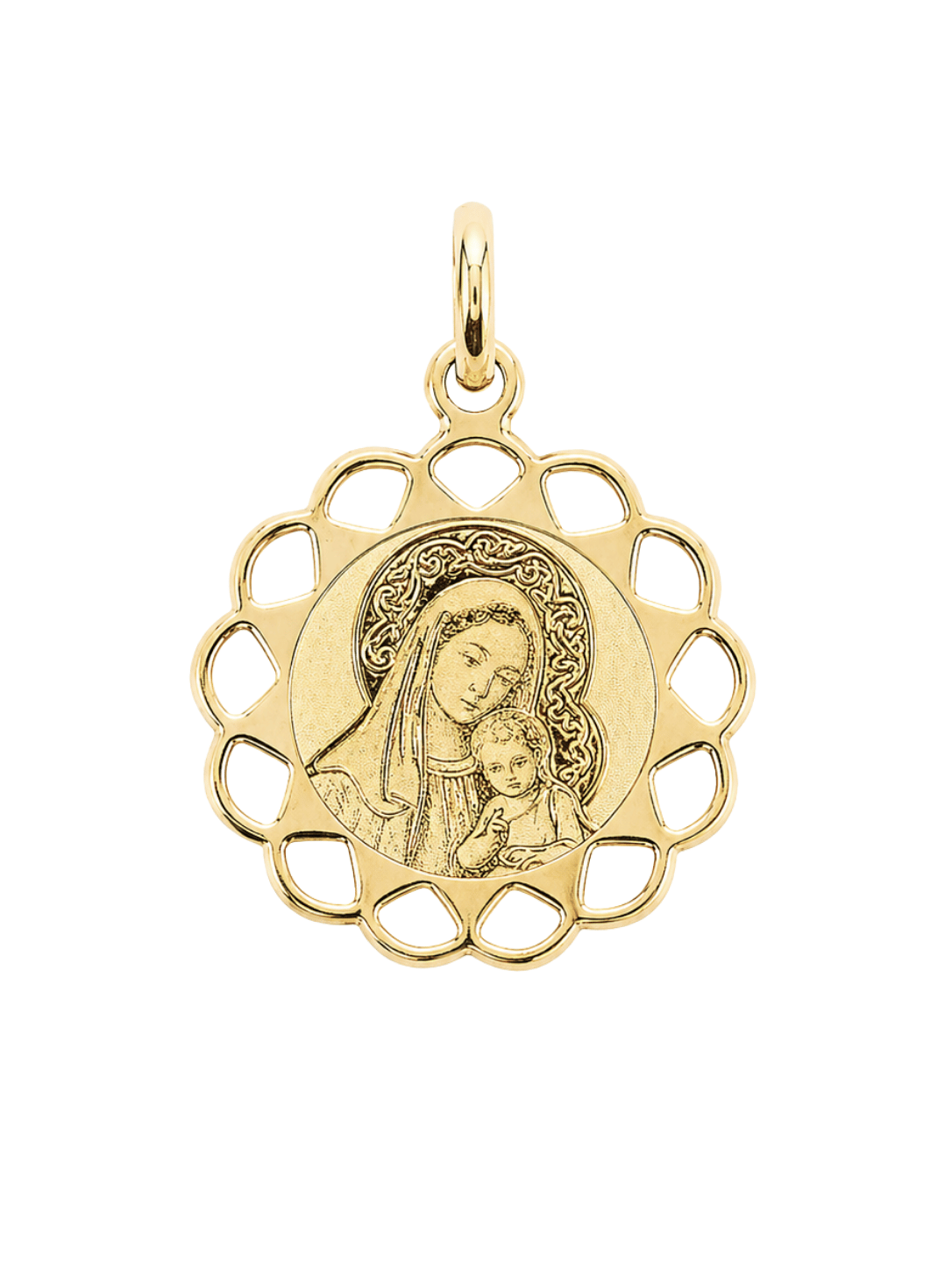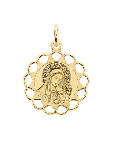 Subtelny medalik wykonany z wysokiej jakości złota próby 585 (14K), przedstawiający wizerunek Matki Bożej z Dzieciątkiem. Klasyczna forma została wzbogacona o dekoracyjną, otwartą ramkę, która nadaje całości lekkości i elegancji.