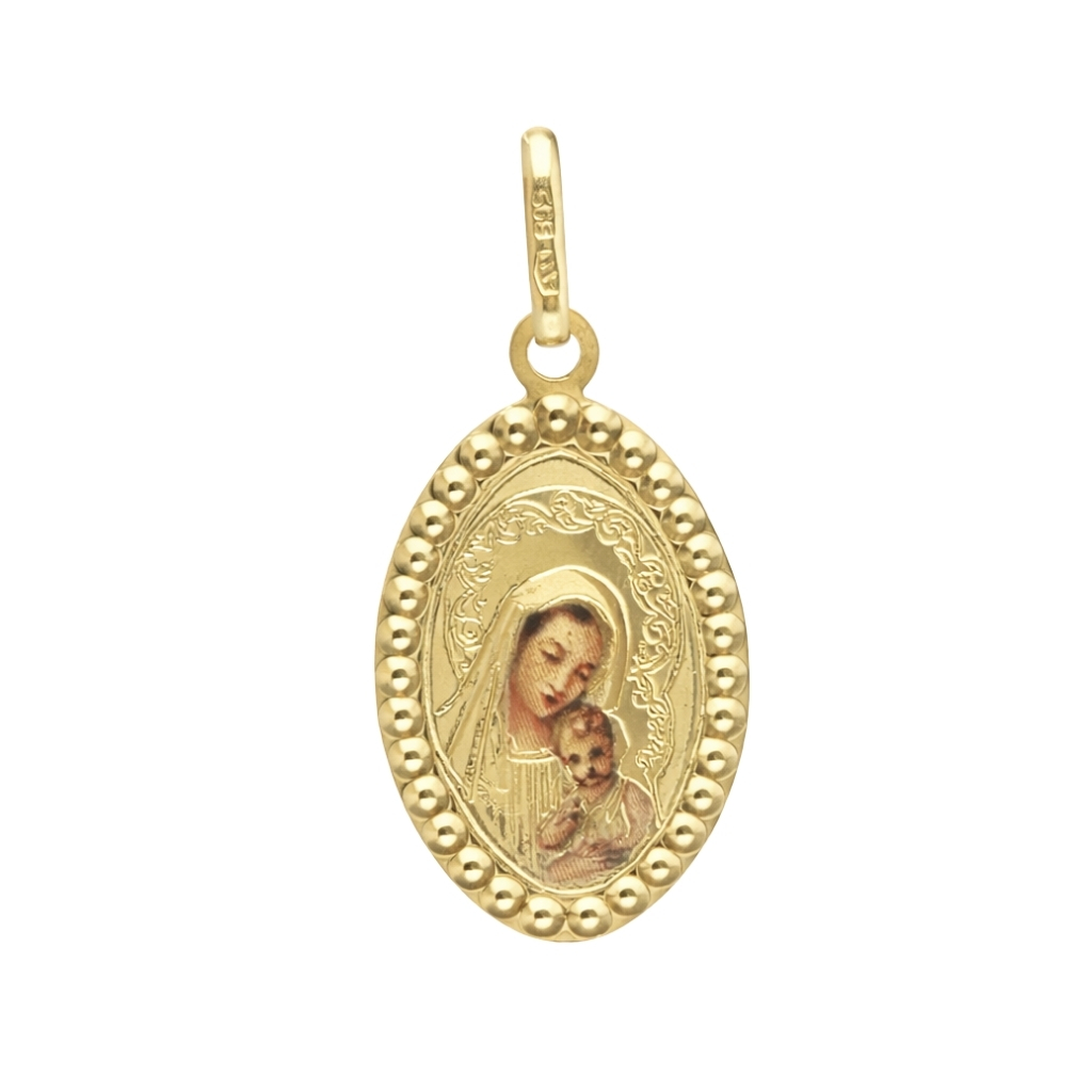 Medalik został wykonany z żółtego złota próby 585 (14K). Dekoracyjna oprawa z drobnymi, wypukłymi zdobieniami subtelnie podkreśla kształt zawieszki i dodaje biżuterii wyjątkowej estetyki. Centralną część zdobi kolorowy wizerunek Matki Bożej z Dzieciątkiem.
