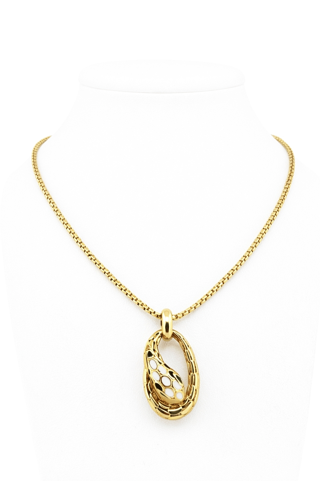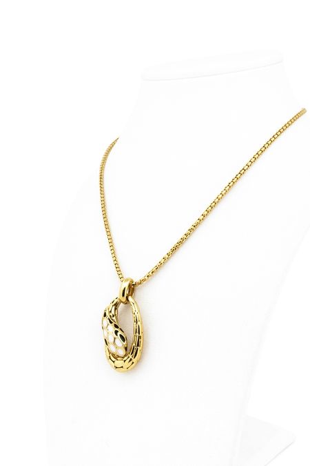 Komplet został wykonany z wysokiej jakości żółtego złota o próbie 585 (14K). Zawieszka ma wyrazistą, ozdobną kompozycję w kształcie węża, opartą na zwartej formie z dopracowanymi detalami powierzchni. Całość wygląda harmonijnie, a jednocześnie przyciąga uwagę starannym wykończeniem i estetyczną formą. Powierzchnia zawieszki posiada wyraźną fakturę oraz kontrastowe akcenty kolorystyczne, które nadają jej głębi i podkreślają dekoracyjny charakter modelu.