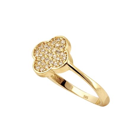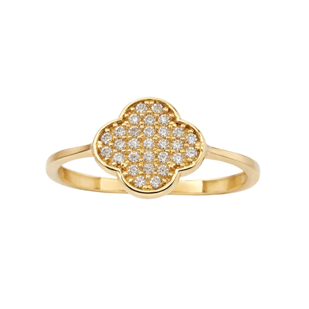 Pierścionek został wykonany z wysokiej jakości żółtego złota próby 585 (14K). Jego delikatna, subtelna forma została wzbogacona dekoracyjnym elementem w kształcie czterolistnej koniczyny, która symbolizuje szczęście i pomyślność.