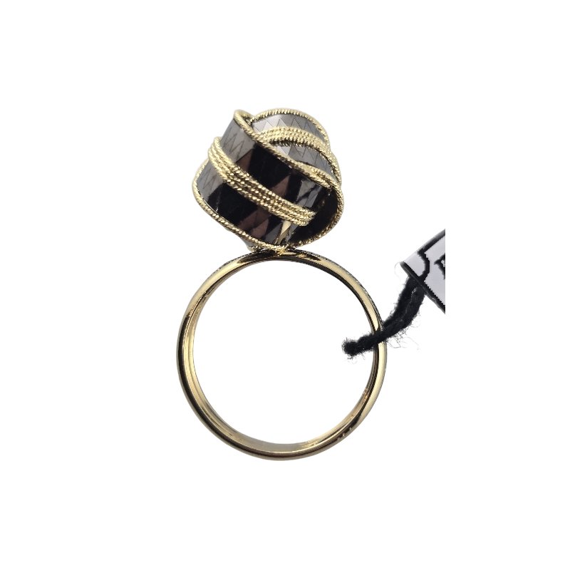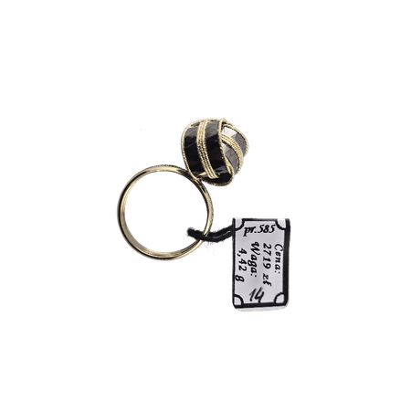 Złoty pierścionek, którego charakterystycznym elementem jest niebanalna pleciona ozdoba wykonana z żółtego i czarnego złota.