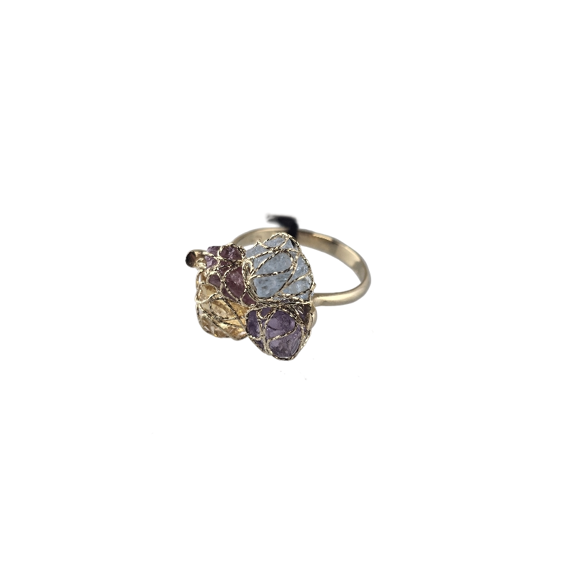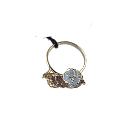 Złoty pierścionek, w centrum którego znajdują się trzy kolorowe kamienie. Kompozycja ta emanuje energią i witalnością.