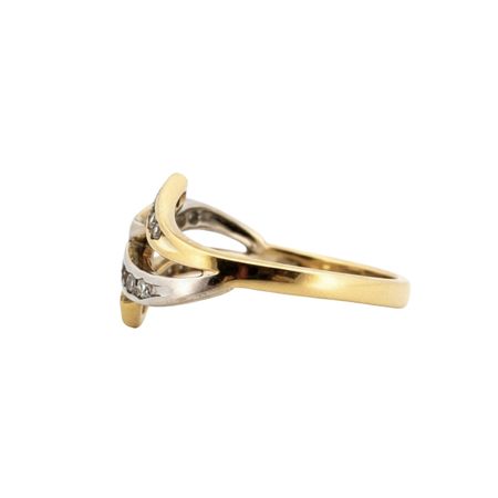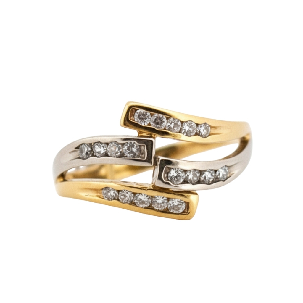 Pierścionek został wykonany z wysokiej jakości żółtego oraz białego złota próby 585 (14K). Jego nowoczesna, wieloelementowa forma przyciąga uwagę dynamicznym układem przeplatających się linii, które nadają biżuterii unikalnego i wyrazistego charakteru.