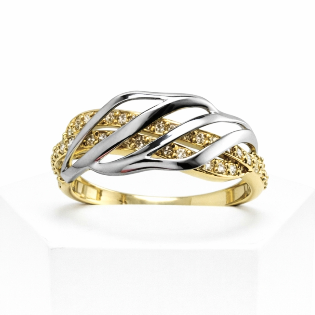 Pierścionek został wykonany z wysokiej jakości żółtego oraz białego złota próby 585 (14K). Harmonijne połączenie dwóch kolorów złota nadaje biżuterii nowoczesnego, a zarazem ponadczasowego charakteru.