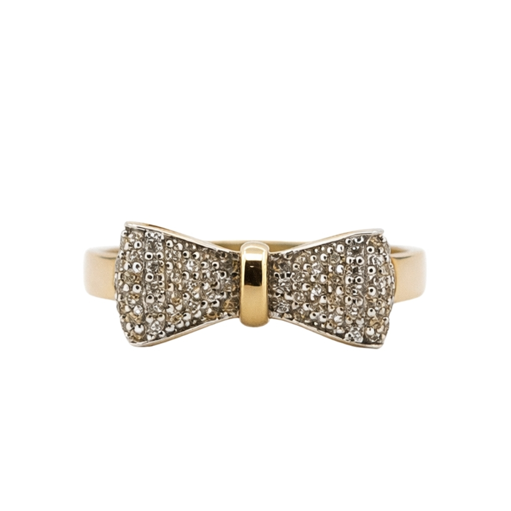 Pierścionek został wykonany z wysokiej jakości żółtego złota próby 585 (14K). Jego wyjątkowy design w formie eleganckiej kokardy nadaje biżuterii subtelnego uroku i kobiecego charakteru.
