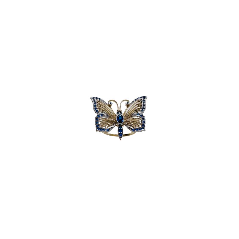 Duży pierścionek wykonany ze złota pr. 585 z niebieskimi cyrkoniami. Biżuteria w kształcie motyla. To piękne połączenie białego i żółtego złota. Pierścionek będzie idealnym  dopełnieniem  codziennej oraz eleganckiej stylizacji, a także piękną pamiątką podarowaną  w dniu ślubu, w dniu rocznicy lub w dniu urodzin.