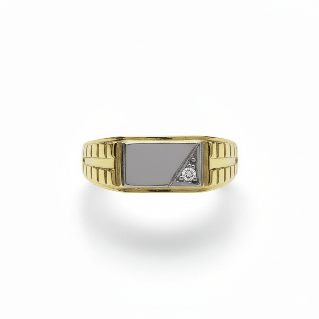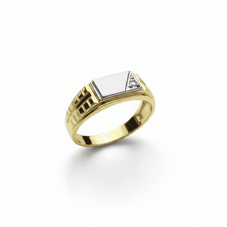 Elegancki pierścionek typu sygnet o wyrazistej, nowoczesnej formie. Połączenie dwóch odcieni złota nadaje mu charakteru i subtelnego kontrastu, podkreślając geometryczny design. Centralną część stanowi gładka, jasna blaszka zestawiona z dekoracyjnym detalem ozdobionym cyrkonią, która dodaje całości delikatnego blasku.