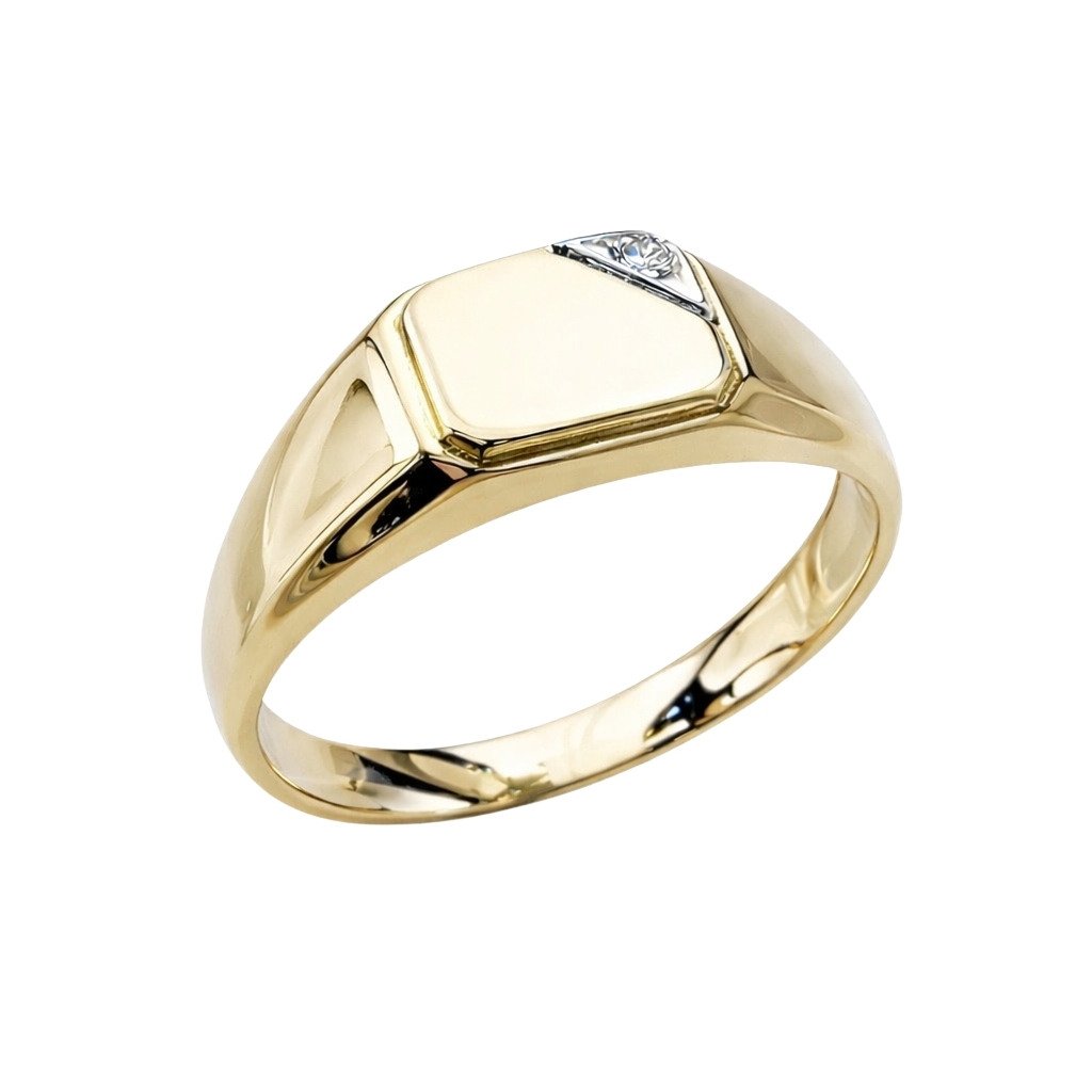 Sygnet został wykonany z wysokiej jakości żółtego złota próby 585 (14K) z eleganckim dodatkiem białego złota, w którym osadzona została delikatna cyrkonia, dodająca świetlistego akcentu.