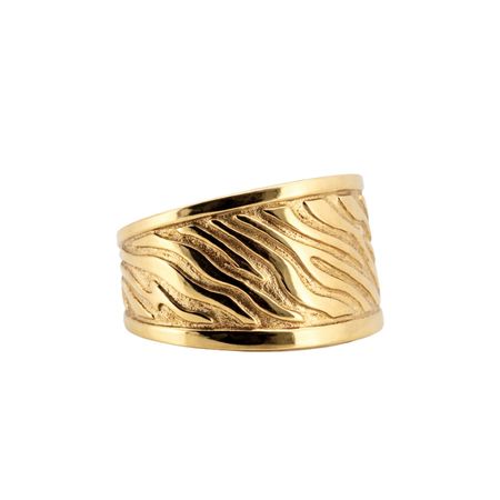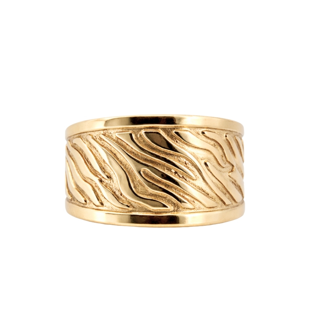 Pierścionek został wykonany z wysokiej jakości żółtego złota próby 585 (14K). Jego szeroka, efektowna forma przyciąga uwagę oryginalnym wzorem inspirowanym naturalnymi, falującymi liniami, które nadają biżuterii wyrazistego i nowoczesnego charakteru.