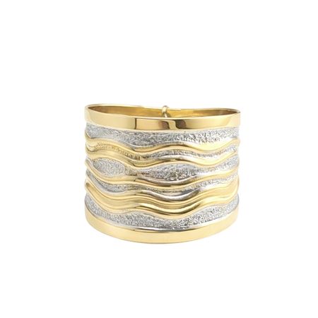 Pierścionek został wykonany z wysokiej jakości żółtego i białego złota próby 585 (14K). Szeroka, efektowna forma została ozdobiona falującymi liniami w dwóch odcieniach kruszcu, tworząc wyjątkową i dynamiczną kompozycję.