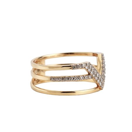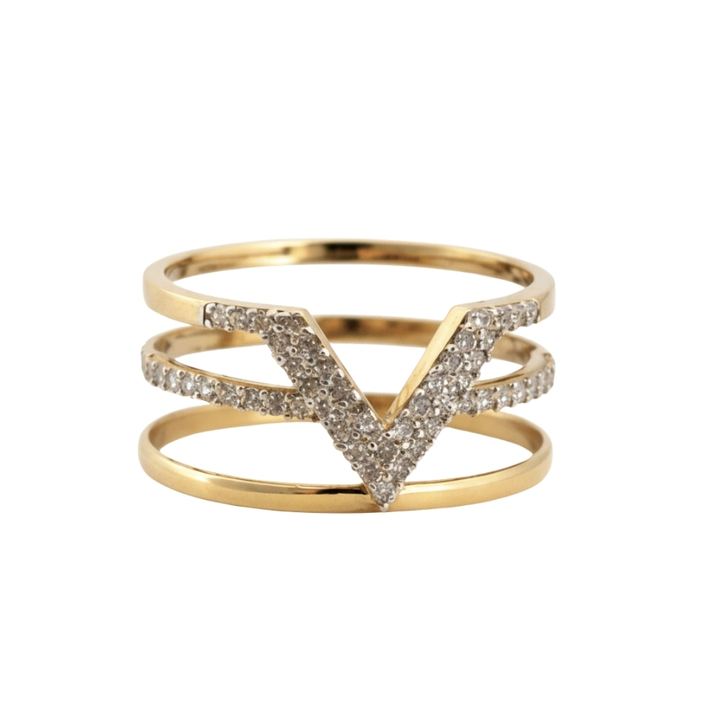 Centralnym elementem jest geometryczny motyw w kształcie litery „V”, ozdobiony drobnymi cyrkoniami, które nadają całości wyrazistego blasku.