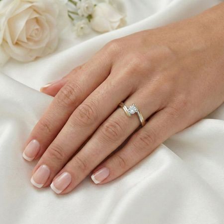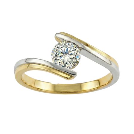 Pierścionek z brylantem został wykonany z połączenia najwyższej jakości żółtego i białego złota próby 585 (14K) oraz brylantu o masie 0,54 ct. Pierścionek ma wyrazistą, nowoczesną formę opartą na dwóch smukłych, przeciwległych ramionach, które subtelnie obejmują centralnie osadzony brylant. Otwarta konstrukcja sprawia, że kamień wydaje się niemal zawieszony pomiędzy elementami obrączki, co nadaje projektowi lekkości i oryginalnego charakteru. Całość prezentuje się dynamicznie i bardzo elegancko, przyciągając uwagę nietypową architekturą i dopracowanymi proporcjami.