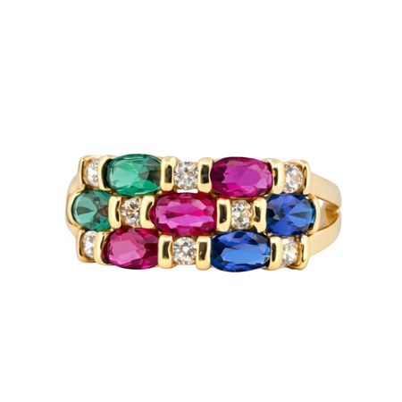 Ozdobą pierścionka są wielokolorowe cyrkonie o owalnym szlifie, przełamane subtelnymi, jasnymi, które pięknie odbijają światło i dodają całości eleganckiego blasku.