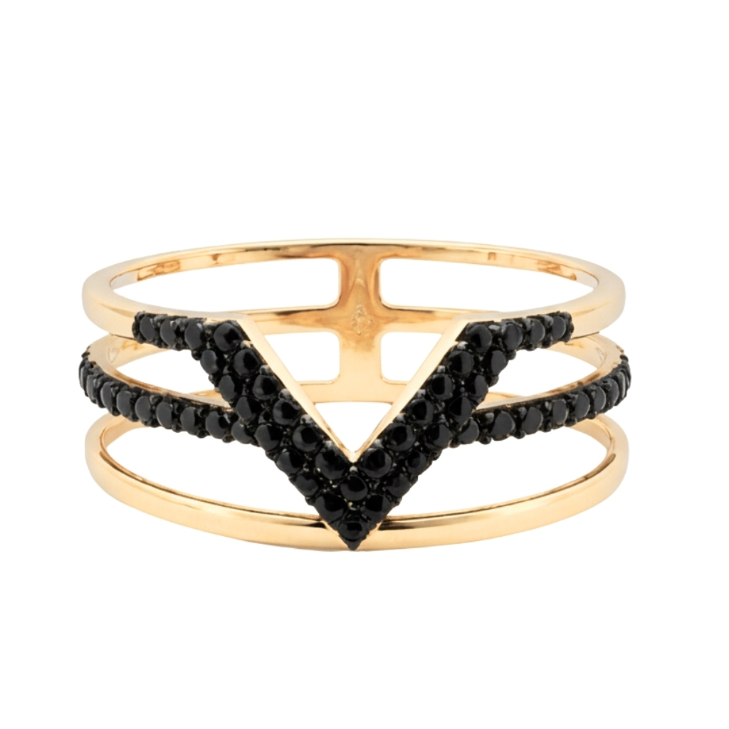 Pierścionek został wykonany z żółtego złota próby 585 (14K). Nowoczesna, ażurowa konstrukcja nadaje mu lekkości, tworząc efektowną, wielopoziomową formę. Centralnym elementem kompozycji jest geometryczny motyw w kształcie litery V, wysadzany czarnymi cyrkoniami, które pięknie kontrastują ze złotem.