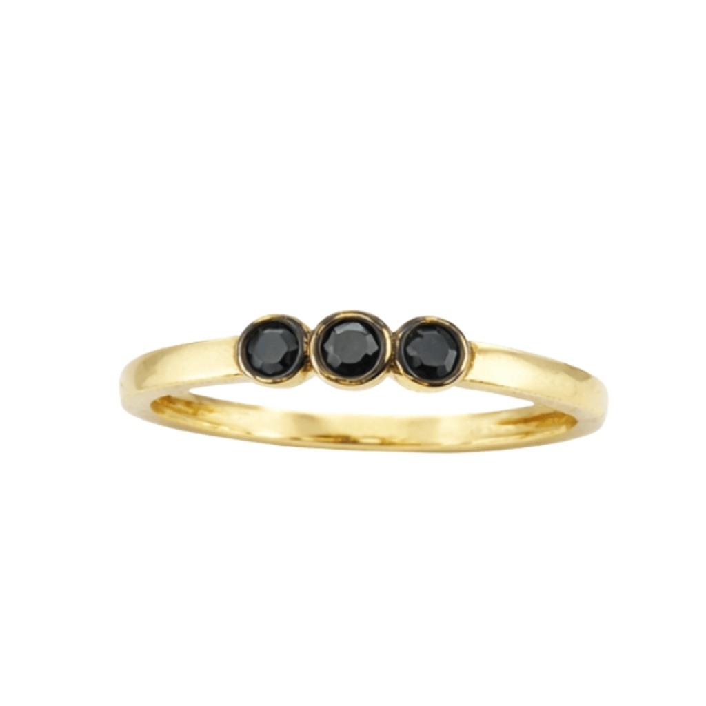 Centralnym elementem pierścionka są trzy czarne cyrkonie osadzone w delikatnych oprawach, które tworzą harmonijną kompozycję. Ich głęboki kolor pięknie kontrastuje z ciepłym odcieniem złota, nadając całości wyjątkowego charakteru i elegancji.