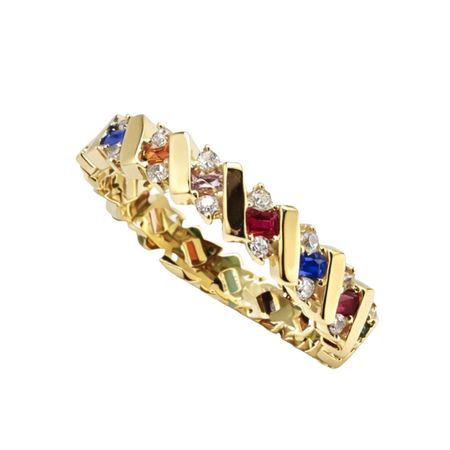 Pierścionek został wykonany z wysokiej jakości żółtego złota próby 585 (14K). Jego efektowna forma została ozdobiona kompozycją wielobarwnych cyrkonii, które nadają biżuterii wyjątkowego, dynamicznego charakteru.