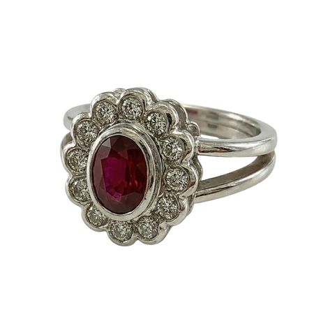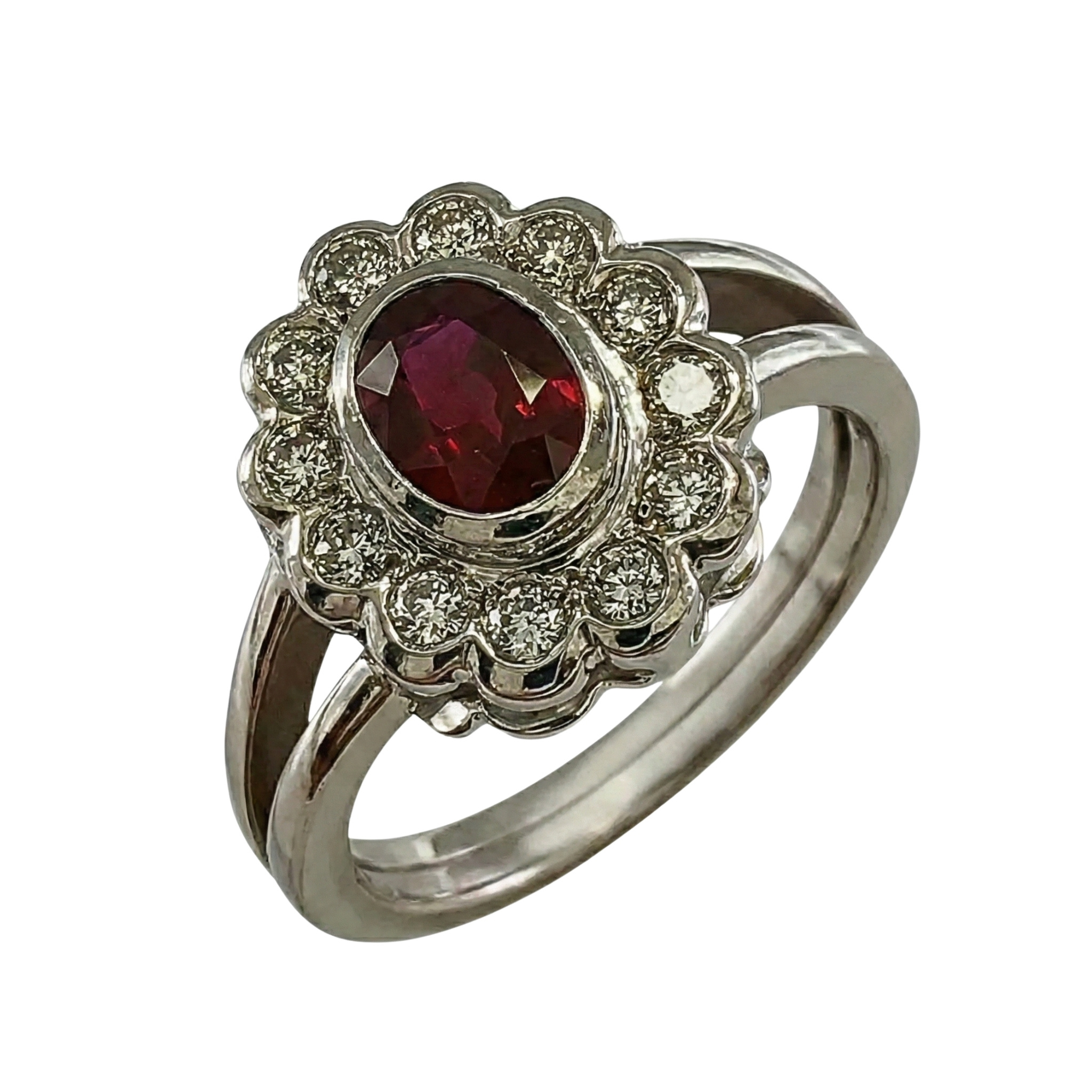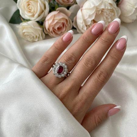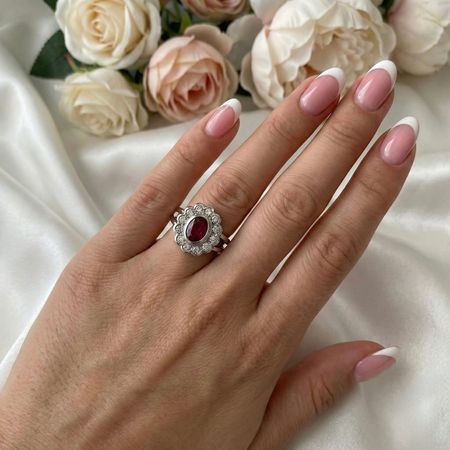 Pierścionek z rubinem i brylantami został wykonany z połączenia najwyższej jakości białego złota próby 585 (14K) oraz brylantami o masie 1,4 ct. Pierścionek wyróżnia się rozbudowaną, warstwową konstrukcją, w której centralna część stanowi wyraźnie dominujący element kompozycji. Owalny rubin został osadzony w podniesionej oprawie i otoczony regularnym kręgiem drobnych brylantów, tworzących dekoracyjną ramę o wyraźnej głębi. Obrączka jest solidna i symetryczna, zaprojektowana tak, aby stabilnie podtrzymywać masywniejszy front pierścionka.