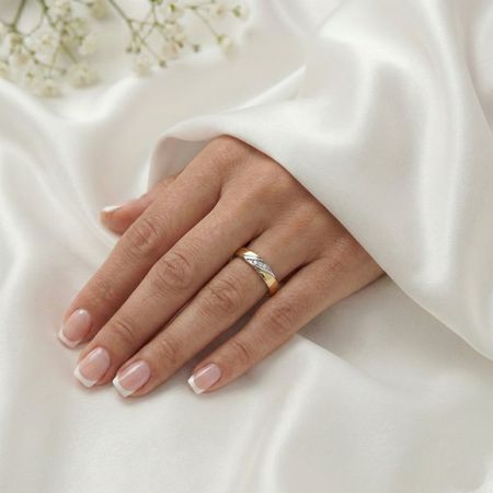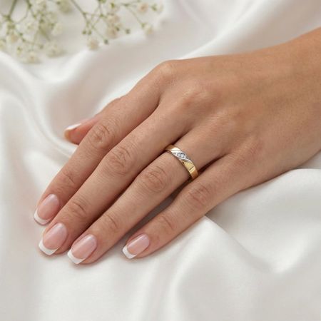 Pierścionek ze złota z 4 brylantami został wykonany z połączenia najwyższej jakości żółtego i białego złota próby 585 (14K) oraz brylantów o masie 0,02 ct. Pierścionek charakteryzuje się klasyczną obrączką oraz smukłą i delikatną formą o nowoczesnym charakterze. Centralnym punktem są niewielkie brylanty osadzone w podłużnym, subtelnie wkomponowanym zagłębieniu, tworząc spójną i elegancką linię. Całość prezentuje się minimalistycznie, tworząc przy tym szykowny efekt.