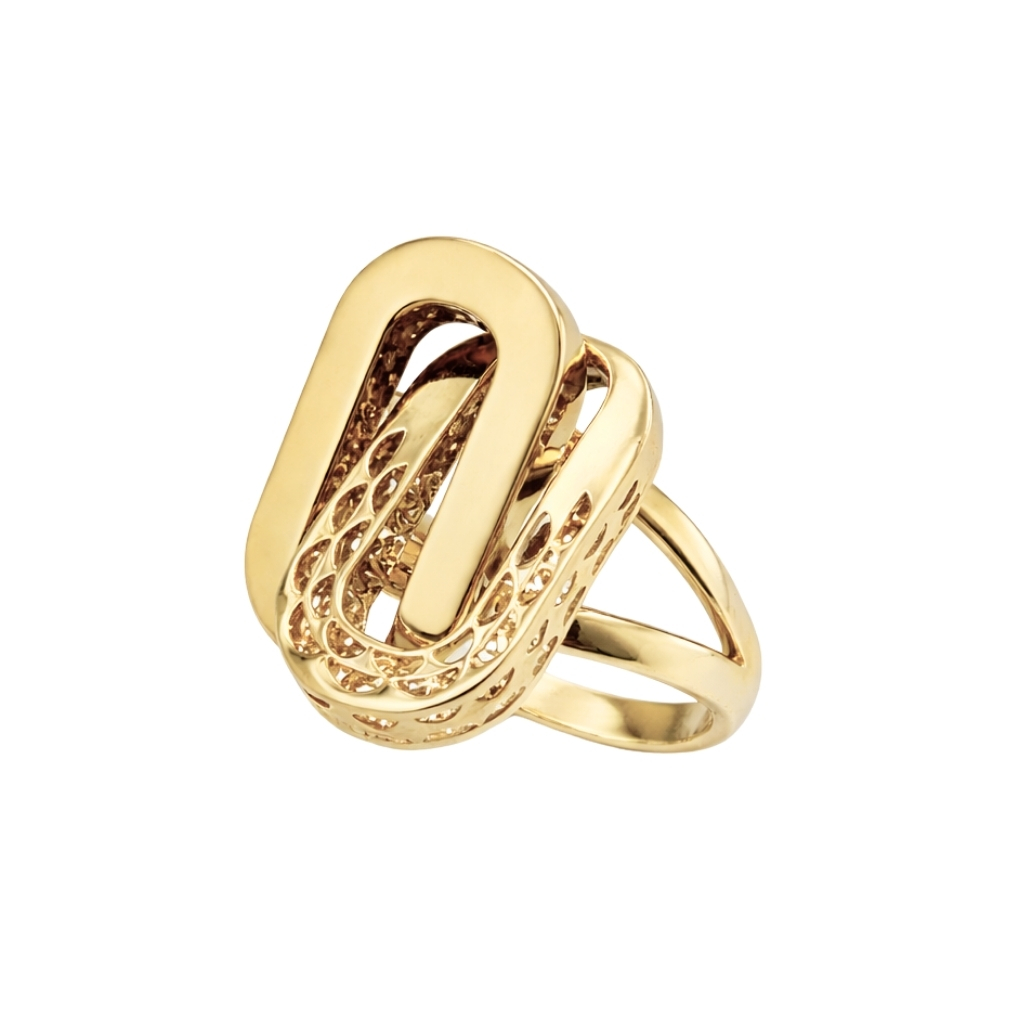 Pierścionek został wykonany z wysokiej jakości żółtego złota próby 585 (14K). Jego nowoczesna, geometryczna forma opiera się na przenikających się, zaokrąglonych kształtach, które tworzą efektowną i oryginalną kompozycję.