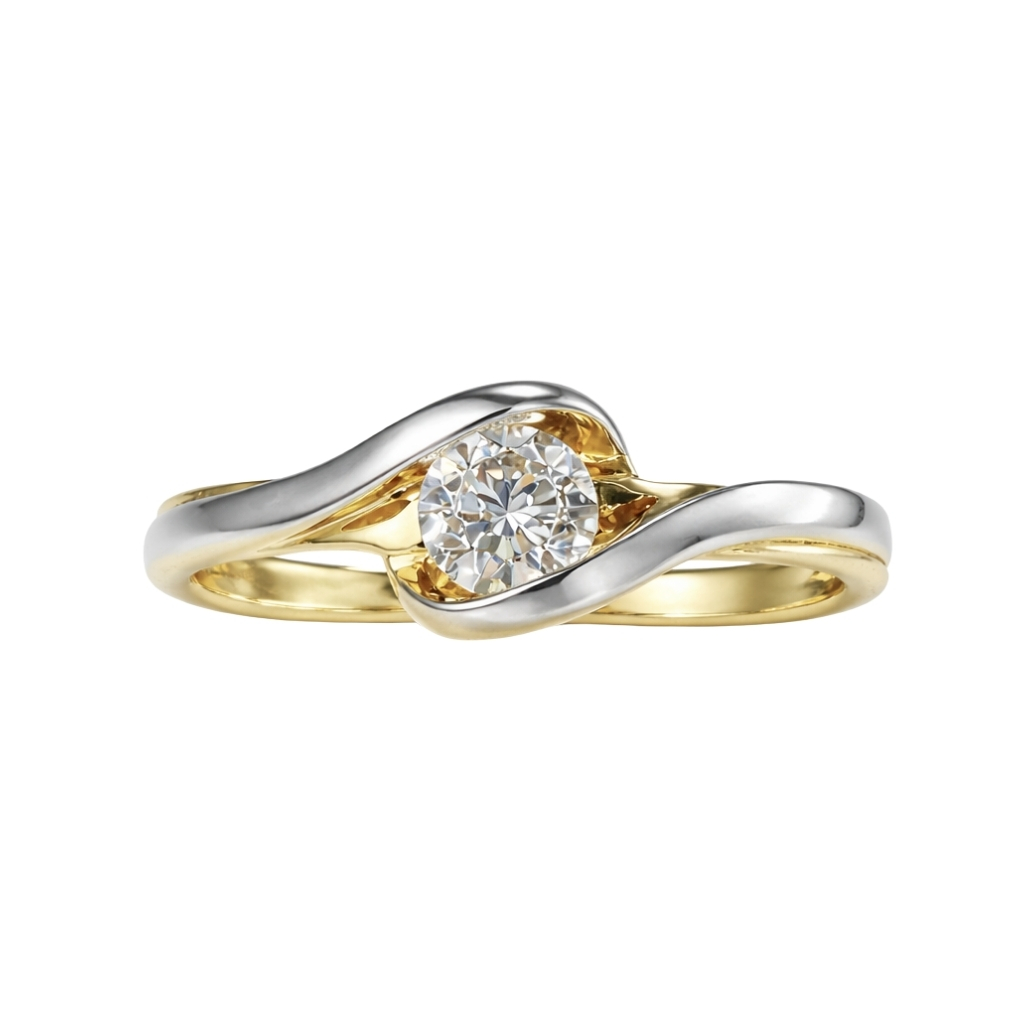 Pierścionek został wykonany z wysokiej jakości żółtego oraz białego złota próby 585 (14K). Ta harmonijna kompozycja kolorystyczna podkreśla nowoczesny charakter biżuterii.