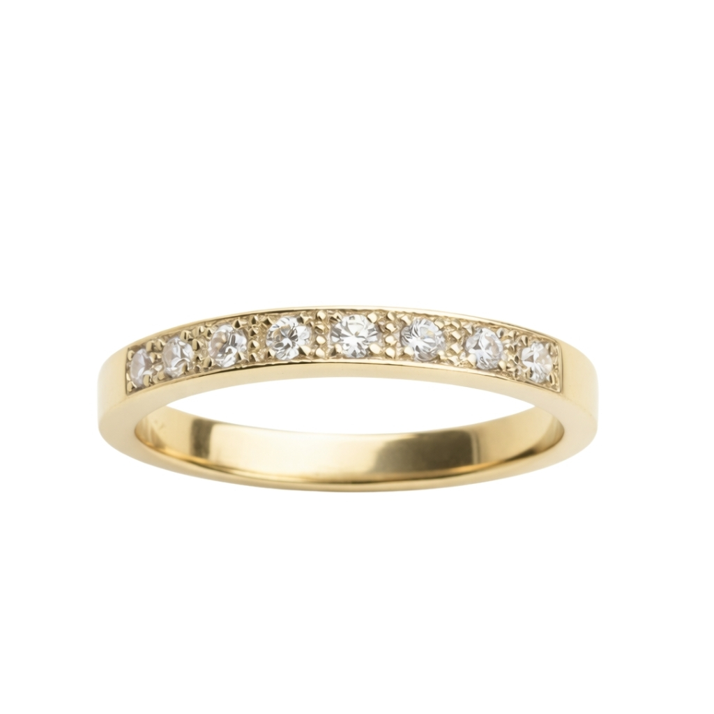 Pierścionek został wykonany z żółtego złota próby 585 (14K). Jego subtelna, klasyczna forma została ozdobiona rzędem lśniących cyrkonii, które nadają całości eleganckiego i ponadczasowego charakteru.