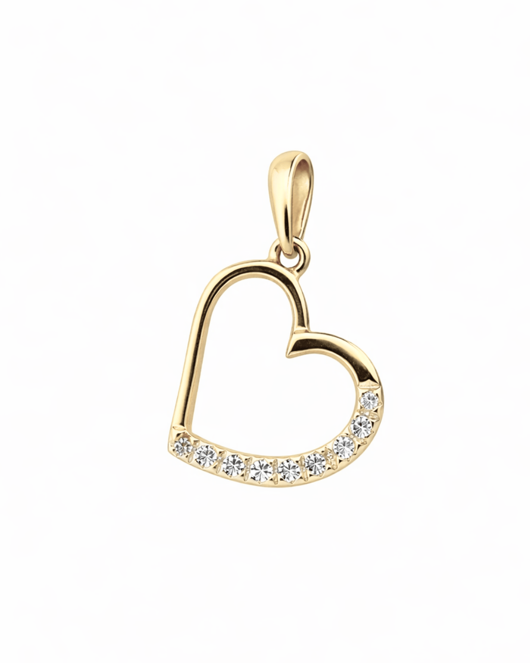 Dolną linię serca zdobią starannie oprawione, lśniące cyrkonie, które pięknie odbijają światło i dodają całości subtelnego blasku. Połączenie gładkiej, polerowanej powierzchni złota z połyskiem kamieni tworzy harmonijną i elegancką kompozycję.