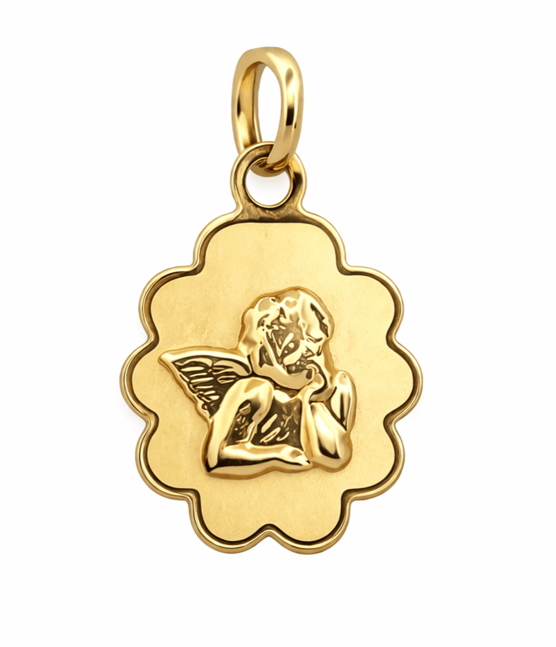 W centralnej części znajduje się wizerunek aniołka w formie subtelnej, wypukłej płaskorzeźby. Tło medalika wykończono delikatną satyną, tworząc harmonijny kontrast z gładką, połyskującą sylwetką anioła oraz ramką zawieszki.
