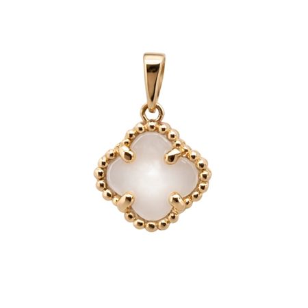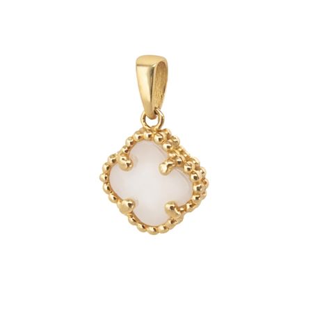 Elegancka zawieszka w kształcie koniczyny została wykonana z wysokiej jakości złota próby 585 (14K). Centralny element ozdobiony jest subtelnie połyskującą masą perłową, której delikatny blask pięknie kontrastuje z ciepłym odcieniem złota. Dekoracyjne wykończenie ramki dodaje całości wyjątkowego charakteru i podkreśla staranność wykonania.