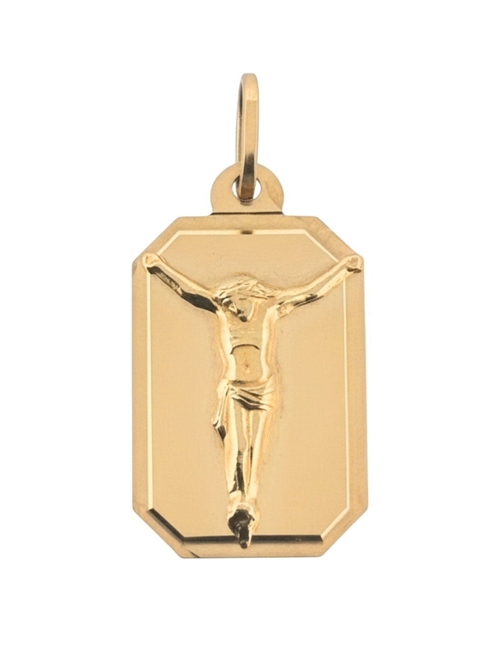 Medalik z wizerunkiem ukrzyżowanego Jezusa został wykonany ze złota próby 585 (14K). Jego klasyczna forma nawiązuje do tradycyjnej symboliki chrześcijańskiej, łącząc prostotę z eleganckim wykończeniem. Centralną część kompozycji stanowi wizerunek Chrystusa umieszczony na gładkiej, prostokątnej blaszce o delikatnie ściętych narożnikach.