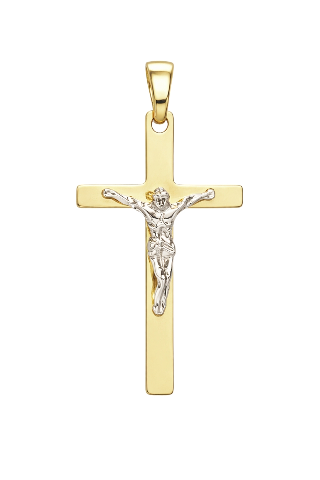 Elegancka zawieszka w formie krzyżyka została wykonana z wysokiej jakości żółtego i białego złota próby 585 (14K). Produkt posiada klasyczną, prostą formę z delikatnie zaokrąglonymi ramionami. Centralnym elementem jest starannie wykonana postać Chrystusa, która wyróżnia się na tle ciepłego odcienia żółtego złota.