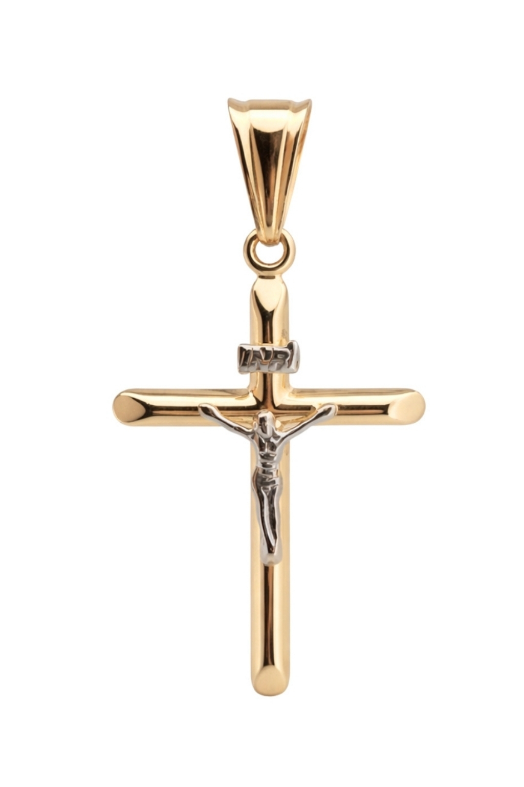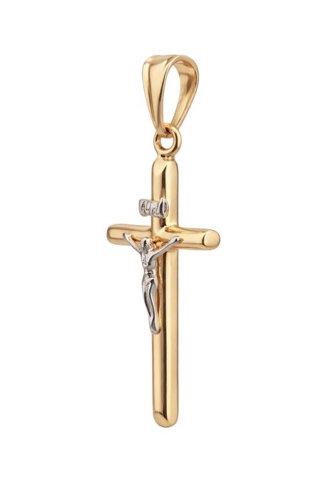 Zawieszka w formie krzyżyka wykonana z wysokiej jakości żółtego i białego złota próby 585 (14K). Klasyczna forma została wzbogacona kontrastem dwóch kolorów, co nadaje biżuterii elegancki i estetyczny wygląd. Centralnym elementem jest starannie wykonana postać Chrystusa. Gładka, wypolerowana powierzchnia pięknie odbija światło, podkreślając szlachetny blask kruszcu.