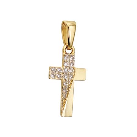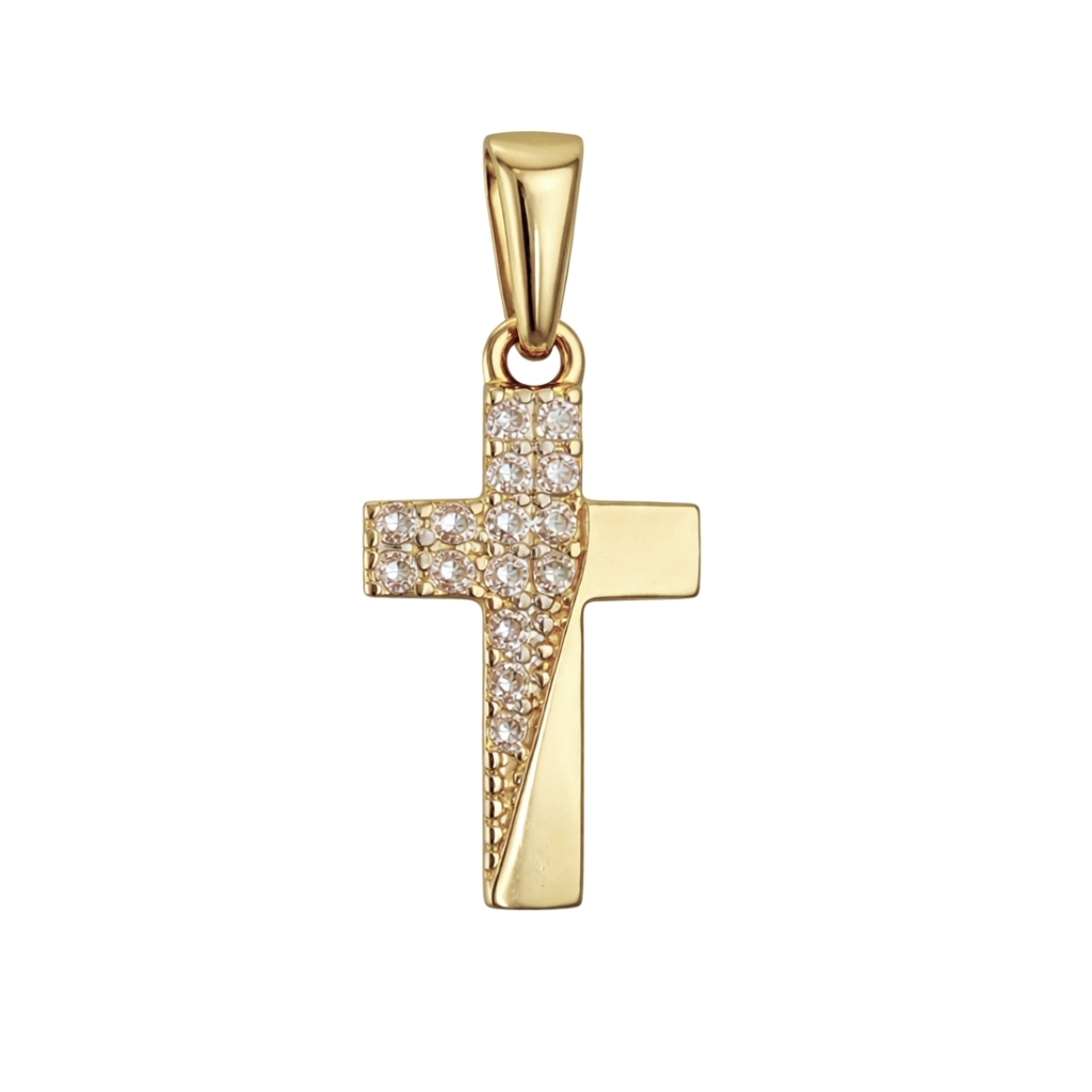 Delikatna zawieszka w kształcie krzyżyka została wykonana z wysokiej jakości żółtego złota próby 585 (14K). Klasyczna forma została wzbogacona subtelnym zdobieniem w postaci lśniących cyrkonii, które pięknie odbijają światło i nadają całości eleganckiego blasku.