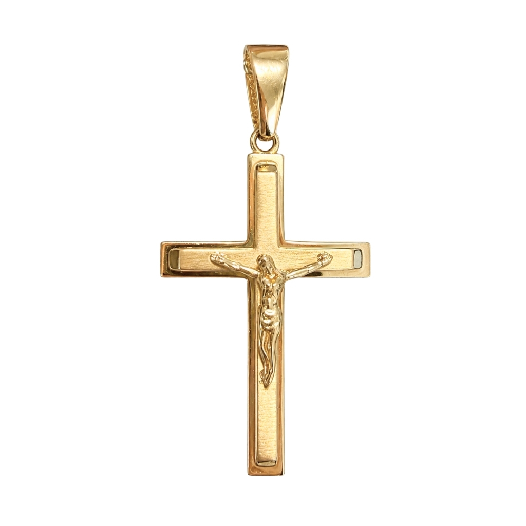 Zawieszka w formie krzyżyka została wykonana z wysokiej jakości żółtego złota próby 585 (14K). Klasyczna, wydłużona forma została wzbogacona o starannie wykonany wizerunek ukrzyżowanego Jezusa Chrystusa, który stanowi centralny punkt kompozycji i nadaje całości wyrazistego charakteru.