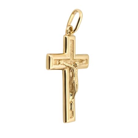 Klasyczna zawieszka w kształcie krzyża z wizerunkiem Jezusa została wykonana z wysokiej jakości złota próby 585 (14K). Starannie dopracowane detale oraz wyraźnie zaznaczona postać Chrystusa nadają biżuterii wyjątkowego, sakralnego charakteru. Polerowane wykończenie w połączeniu z delikatnie matowanym tłem podkreśla głębię wzoru i precyzję wykonania.