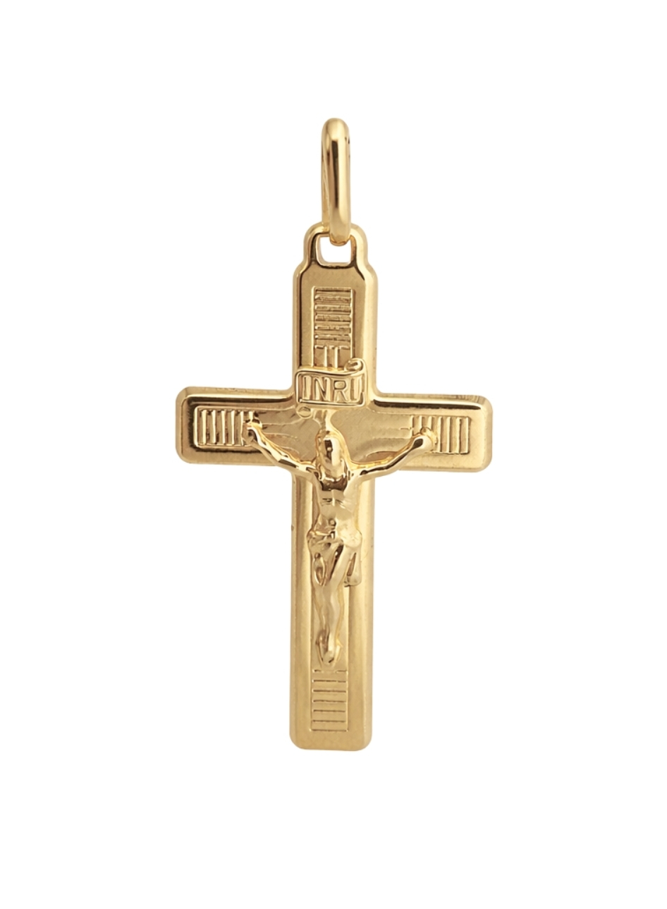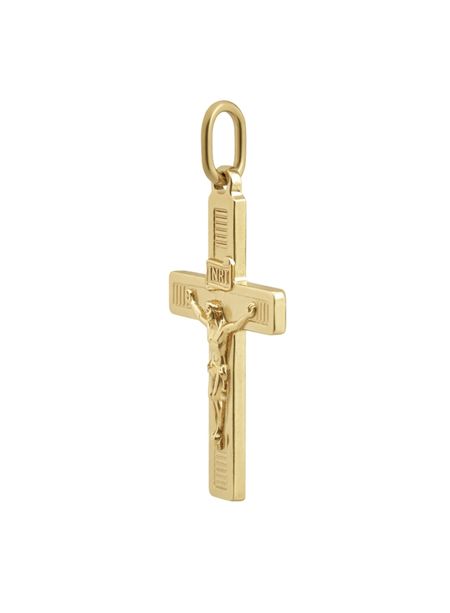 Dodatkowym elementem jest tabliczka z napisem INRI, która podkreśla tradycyjny charakter biżuterii oraz jej symboliczne znaczenie. Gładko wypolerowana powierzchnia pięknie odbija światło, uwydatniając naturalny blask złota i precyzję wykonania detali.