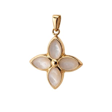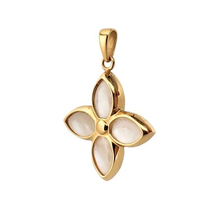 Subtelna zawieszka w kształcie kwiatu została wykonana z wysokiej jakości złota próby 585 (14K). Płatki ozdobione zostały delikatnie połyskującą masą perłową, która nadaje biżuterii eleganckiego, naturalnego blasku i podkreśla jej kobiecy charakter.