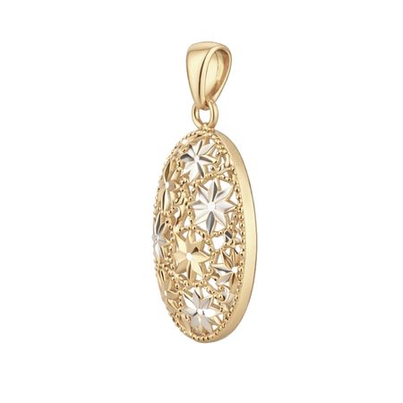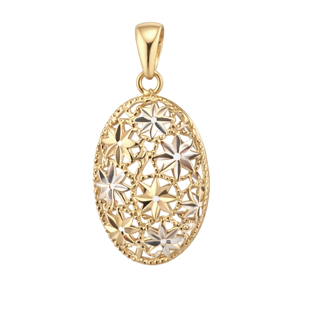 Zawieszka została wykonana z wysokiej jakości żółtego i białego złota próby 585 (14K). Owalna forma o ażurowej strukturze została ozdobiona motywem delikatnych kwiatów, które tworzą harmonijną kompozycję. Kontrast dwóch odcieni złota nadaje biżuterii wyjątkowej głębi oraz eleganckiego charakteru.