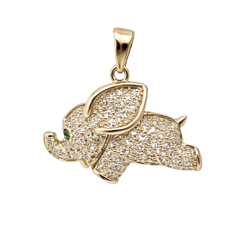 Efektowna zawieszka w kształcie słonia została wykonana z wysokiej jakości złota próby 585 (14K). Powierzchnia biżuterii została starannie ozdobiona lśniącymi cyrkoniami, które nadają całości wyjątkowego blasku i podkreślają precyzję wykonania. Subtelny detal w postaci kontrastowego oczka dodaje zawieszce wyrazistości.