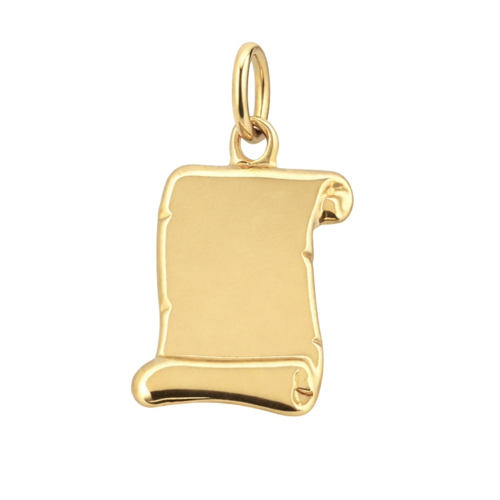 Subtelna zawieszka w kształcie pergaminu została wykonana z wysokiej jakości złota próby 585 (14K). Gładka, polerowana powierzchnia nadaje jej eleganckiego charakteru, a delikatnie wyprofilowane krawędzie w formie zwiniętego zwoju podkreślają oryginalność wzoru.