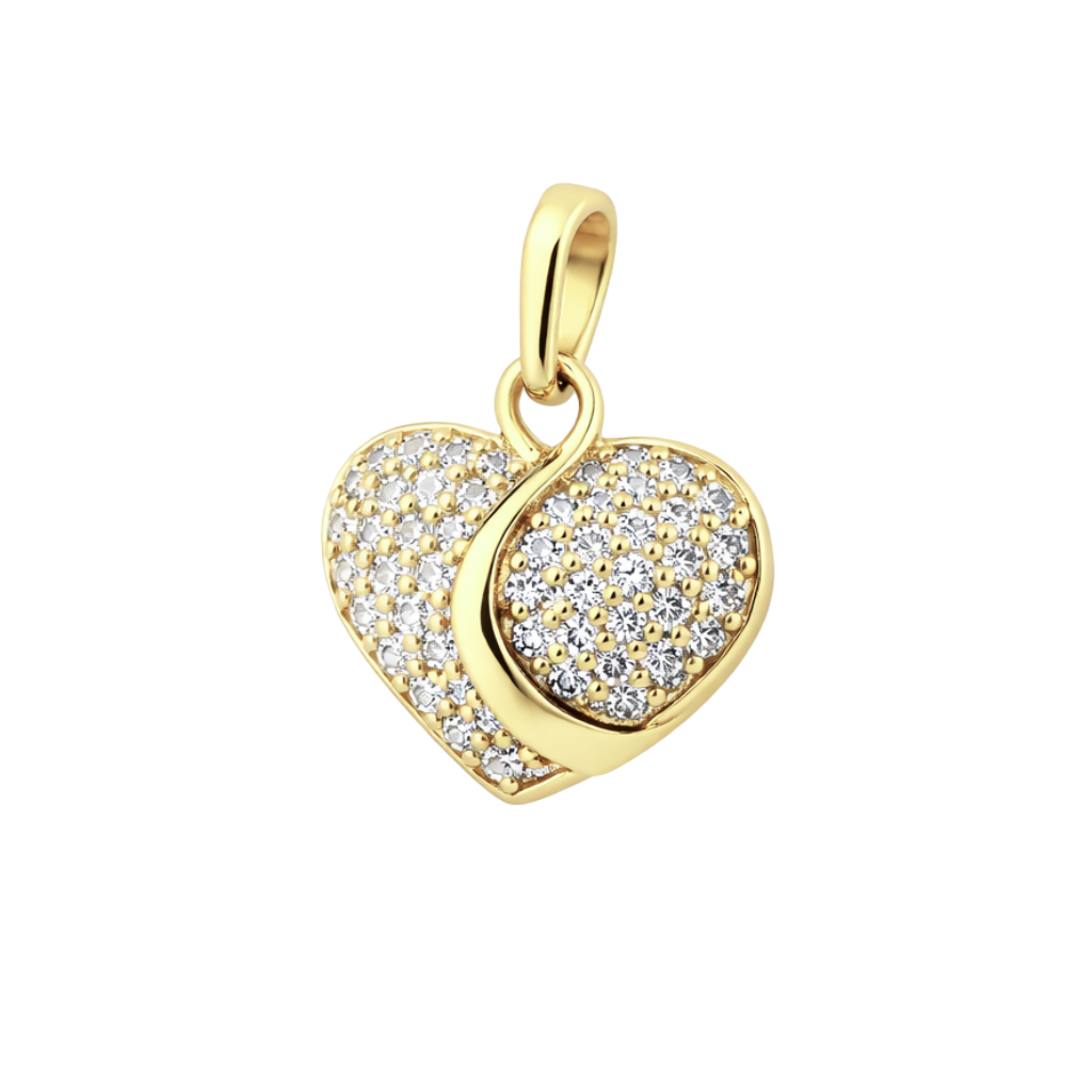 Powierzchnię serca zdobią drobne, precyzyjnie rozmieszczone kamienie, które pięknie odbijają światło i nadają biżuterii wyjątkowego blasku. Centralny, złoty element o płynnej, falującej linii subtelnie dzieli kompozycję, tworząc harmonijny kontrast pomiędzy połyskiem kamieni a lustrzaną powierzchnią złota. Delikatna ramka podkreśla kontur zawieszki, nadając jej eleganckiego wykończenia.