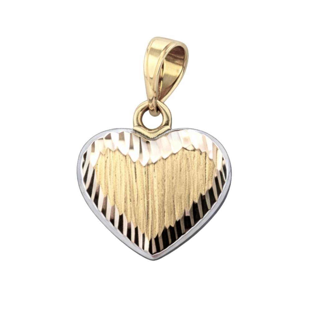 Elegancka zawieszka w kształcie serca została wykonana z połączenia żółtego oraz białego złota próby 585 (14K). Centralną część serca zdobi subtelnie fakturowana powierzchnia, która pięknie odbija światło i podkreśla szlachetność produktu. Obrzeże zostało dodatkowo ozdobione dekoracyjnym szlifem, tworząc efektowną, świetlistą ramę. Kontrast kolorów sprawia, że zawieszka prezentuje się niezwykle stylowo i ponadczasowo.