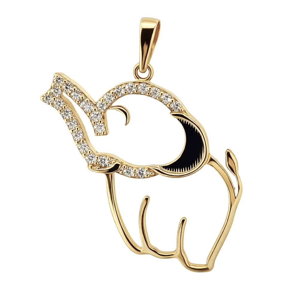 Zawieszka została wykonana z wysokiej jakości żółtego złota próby 585 (14K). Jej forma przedstawia sylwetkę słonia, który symbolizuje siłę, mądrość i szczęście. Kontur zdobiony lśniącymi białymi cyrkoniami nadaje kompozycji wyjątkowego blasku, podkreślając elegancki charakter biżuterii.