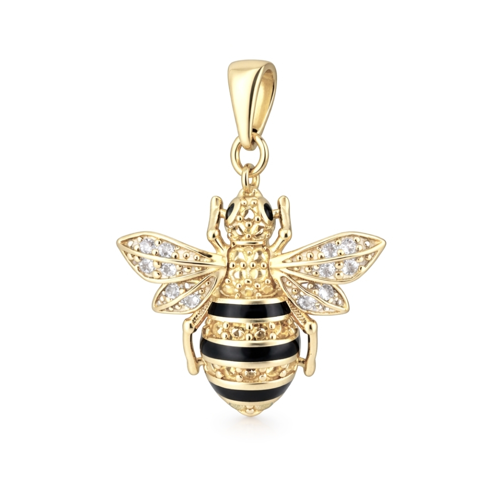 Zawieszka z motywem pszczoły została wykonana z wysokiej jakości złota próby 585 (14K). Precyzyjnie dopracowana forma zachwyca bogactwem detali. Skrzydła ozdobione lśniącymi cyrkoniami subtelnie odbijają światło, nadając biżuterii wyjątkowego blasku. Kontrastowe, ciemne akcenty podkreślają charakterystyczne pasy, nadając kompozycji wyrazistości i nowoczesnego wykończenia.
