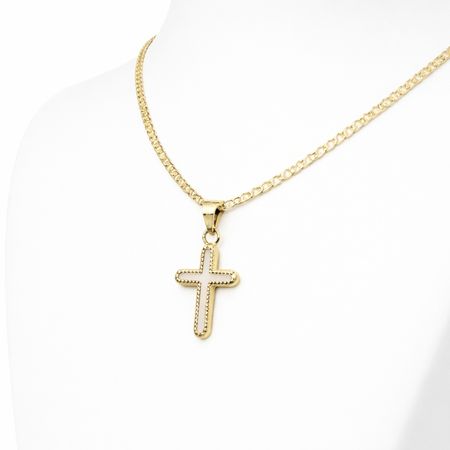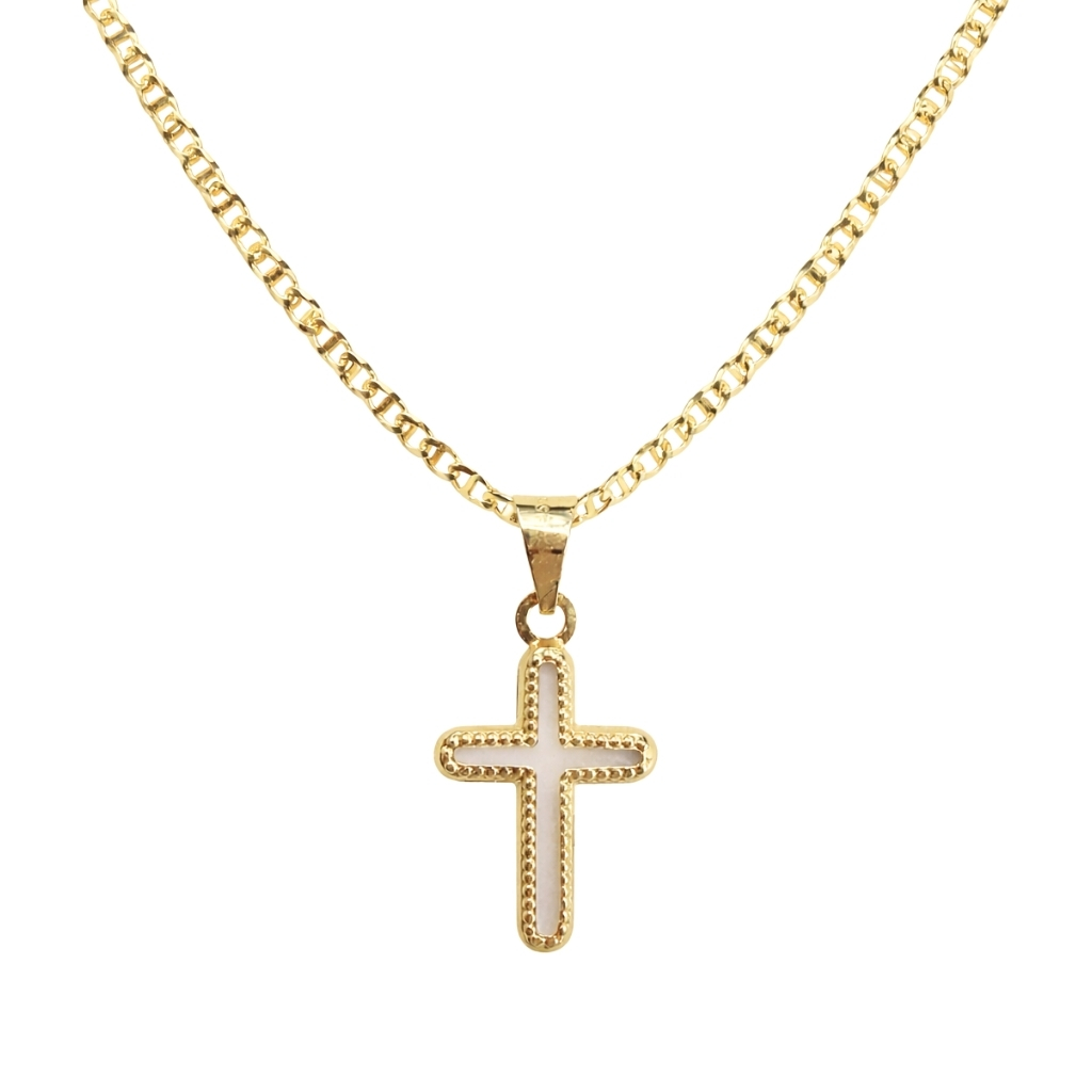 W skład zestawu wchodzi subtelna zawieszka w formie krzyżyka, zdobiona delikatną masą perłową, która nadaje biżuterii wyjątkowej lekkości i szlachetnego blasku. Uzupełnieniem kompletu jest solidny łańcuszek o splocie gucci, który wyróżnia się nowoczesnym designem i trwałością.