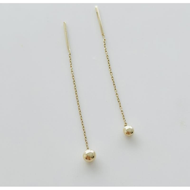 Przewlekane kolczyki zakończone złotą kuleczką. Zostały wykonane z dbałością o każdy szczegół. Biżuteria ta będzie towarzyszyć kobiecie przez długie lata. Kolczyki charakteryzują się niepowtarzalnym stylem, który docenią panie lubiące biżuterię dopracowaną w każdym detalu.