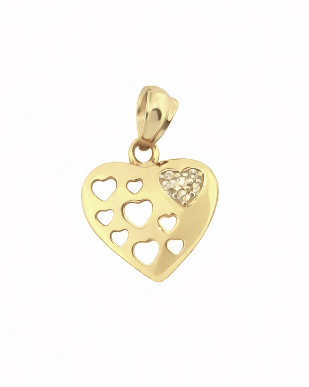 Wisiorek w kształcie serca został wykonany z żółtego złota próby 585. Model wyróżnia się lekką, ażurową formą z wyciętymi motywami małych serduszek, które nadają mu subtelności i romantycznego charakteru.